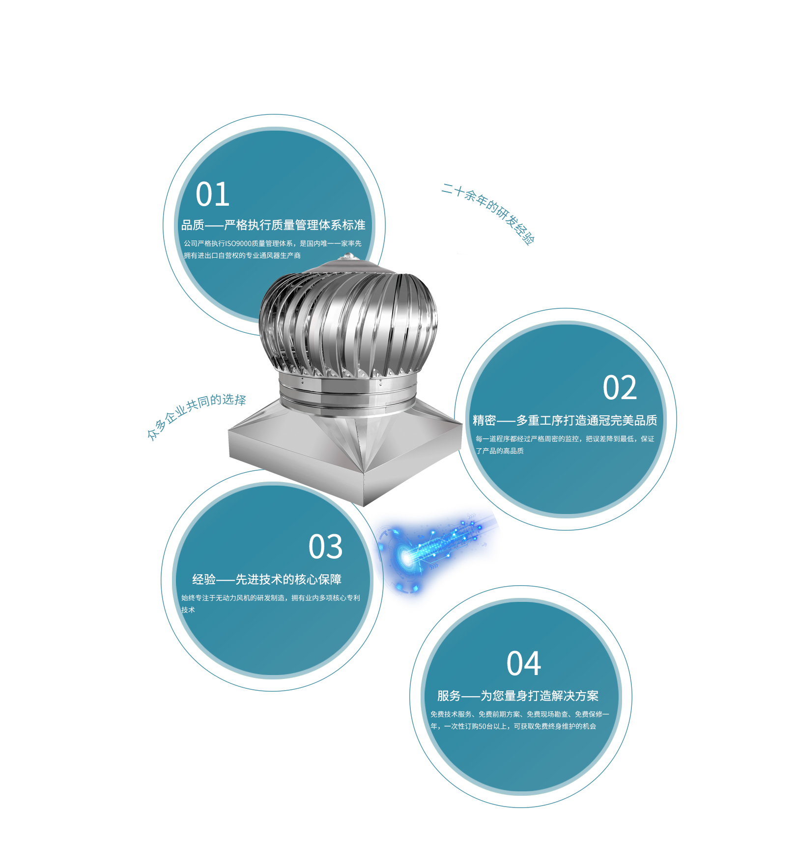 天長市通冠無動力風機有限公司,是集研發(fā)、生產(chǎn)、銷售于一體的,專業(yè)無動力風機生產(chǎn)廠家。公司坐落于205國道南京與揚州之間,位于省級高新經(jīng)濟技術(shù)工業(yè)園,交通便利?!巴ü凇庇兄恢Ъ夹g(shù)精湛、服務(wù)非凡的隊伍。所有一線技術(shù)工人技術(shù)熟練、質(zhì)量意識強。公司嚴格執(zhí)行ISO9000質(zhì)量管理體系,一貫貫徹“以質(zhì)量為生命”、“以信譽為根本”、“以服務(wù)為基礎(chǔ)”的理念···[查看詳細]